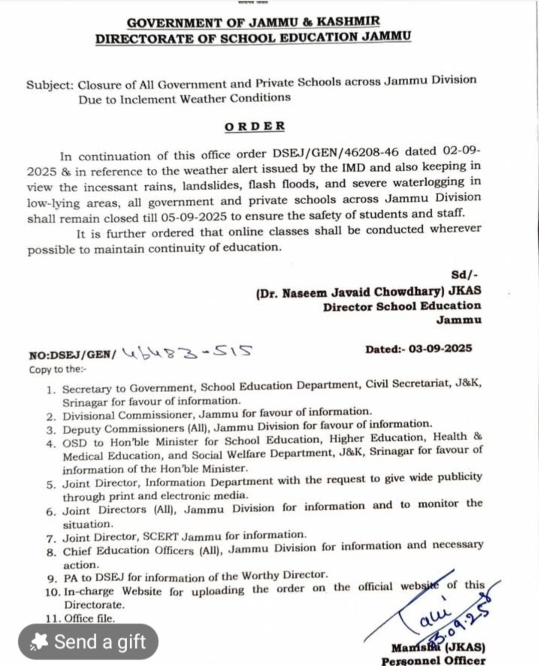 The fresh order issued by Dr. Naseem Javaid Chowdhary (Director, School Education Jammu) references the earlier notification dated 2nd September 2025 and states that, due to the Indian Meteorological Department (IMD) weather alert, the closure will continue until 05-09-2025.