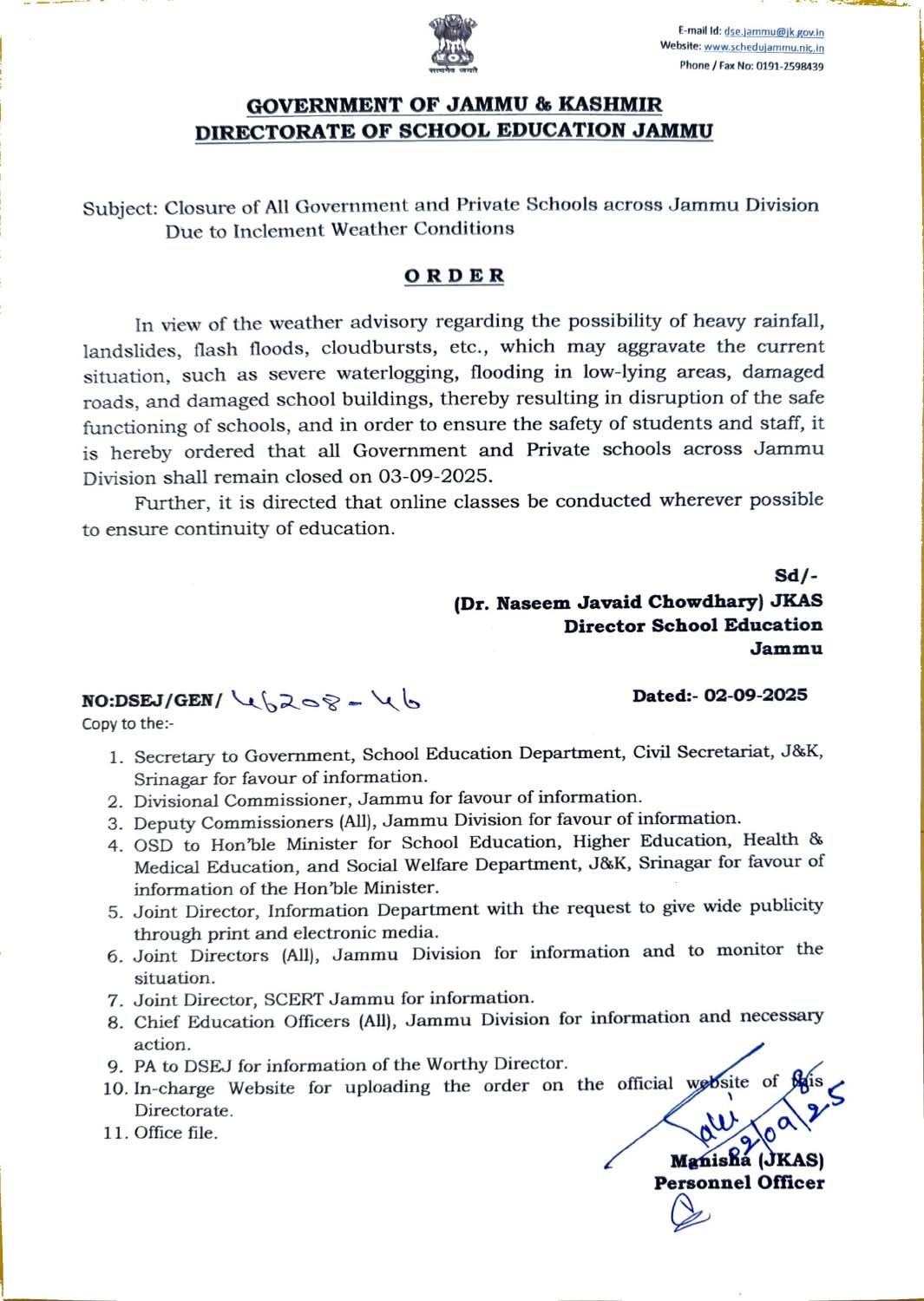The Directorate of School Education Jammu (DSEJ) has officially ordered that all Government and Private schools across Jammu Division will remain School Closed and all exam postponed on 03-09-2025 due to severe weather conditions. Continuous heavy rainfall, waterlogging, and landslides have created unsafe situations for commuting students and staff.