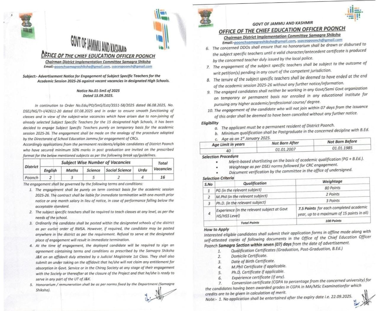 The District Implementation Committee Samagra Shiksha, Poonch, has released an official advertisement (Notice No.01-SnS of 2025) for engaging Subject Specific Teachers to fill vacancies in 15 designated high schools across the district.